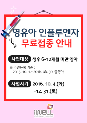 영유아 인플루엔자 무료접종 안내 페이지 정보 작성자 관리자 작성일16-09-28 15:27 조회20,531회 관련링크 이전글 다음글 목록 본문 영유아 인플루엔자 무료접종 안내 이전글 다음글 목록