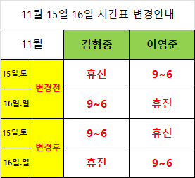 11월 15일 16일 시간표 변경안내 페이지 정보 작성자 관리자 작성일25-11-07 13:40 조회446회 관련링크 이전글 다음글 목록 본문 11월 15일 16일 시간표 변경안내 이전글 다음글 목록