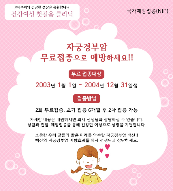 자궁경부암 무료접종으로 예방하세요!! 페이지 정보 작성자 관리자 작성일16-07-11 10:56 조회21,016회 관련링크 이전글 다음글 목록 본문 자궁경부암 무료접종으로 예방하세요!! 이전글 다음글 목록