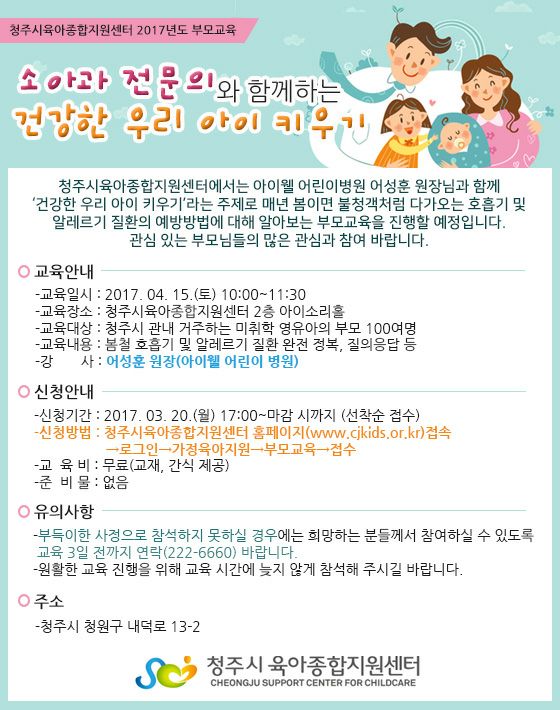 '청주시 육아종합지원센터 2017 부모교육' 안내 페이지 정보 작성자 관리자 작성일17-03-30 07:48 조회24,824회 관련링크 이전글 다음글 목록 본문 . 이전글 다음글 목록