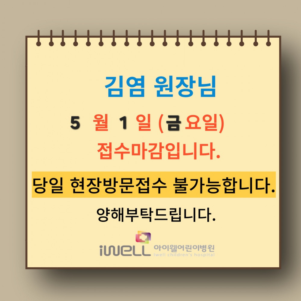 김염 원장님 5월 1일(금) 접수마감 페이지 정보 작성자 관리자 작성일26-04-29 12:51 조회8회 관련링크 이전글 목록 본문 김염 원장님 5월 1일(금) 접수마감 이전글 목록