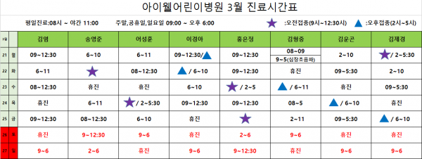 아이웰어린이병원 22.03.21~22.03.27 진료시간표입니다. 페이지 정보 작성자 관리자 작성일22-03-16 14:11 조회12,477회 관련링크 이전글 다음글 목록 본문 . 이전글 다음글 목록