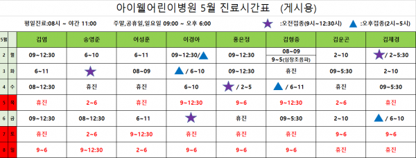 아이웰어린이병원 22.05.02~05.08 진료시간표입니다. 페이지 정보 작성자 관리자 작성일22-04-28 14:55 조회12,545회 관련링크 이전글 다음글 목록 본문 . 이전글 다음글 목록