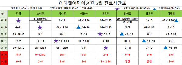 아이웰어린이병원 22.05.23~22.05.29 진료시간표입니다 페이지 정보 작성자 관리자 작성일22-05-19 09:58 조회12,566회 관련링크 이전글 다음글 목록 본문 . 이전글 다음글 목록