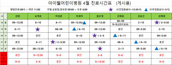 아이웰어린이병원 22.04.18~04.24 진료시간표입니다. 페이지 정보 작성자 관리자 작성일22-04-15 09:40 조회12,197회 관련링크 이전글 다음글 목록 본문 . 이전글 다음글 목록