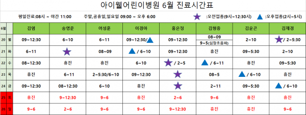 아이웰어린이병원 22.06.20~06.26 진료시간표입니다. 페이지 정보 작성자 관리자 작성일22-06-14 09:21 조회12,898회 관련링크 이전글 다음글 목록 본문 . 이전글 다음글 목록