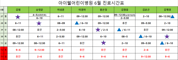 아이웰어린이병원 22.06.27~07.03 진료시간표입니다. 페이지 정보 작성자 관리자 작성일22-06-24 10:42 조회12,272회 관련링크 이전글 다음글 목록 본문 . 이전글 다음글 목록