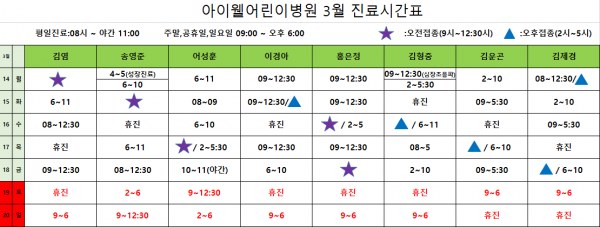 아이웰어린이병원 22.03.14~03.20 진료시간표입니다.