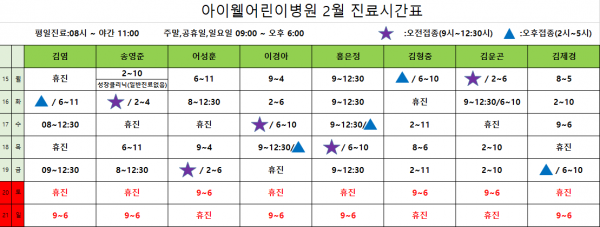아이웰어린이병원 21.02.15~02.21 진료시간표입니다 페이지 정보 작성자 관리자 작성일21-02-09 16:55 조회14,935회 관련링크 이전글 다음글 목록 본문 . 이전글 다음글 목록