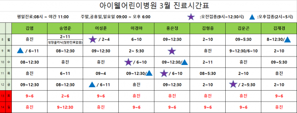 아이웰어린이병원 21.03.08~03.14 진료시간표입니다.