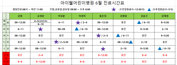 아이웰어린이병원 6.28~7.4 진료시간표입니다. 페이지 정보 작성자 관리자 작성일21-06-24 15:00 조회13,577회 관련링크 이전글 다음글 목록 본문 . 이전글 다음글 목록