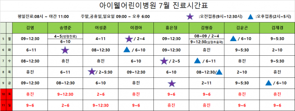아이웰어린이병원 21.07.05~07.11 진료시간표입니다. 페이지 정보 작성자 관리자 작성일21-07-02 14:43 조회13,288회 관련링크 이전글 다음글 목록 본문 . 이전글 다음글 목록