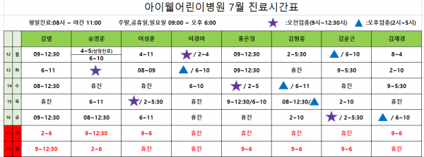 아이웰어린이병원 21.07.12~07.18 진료시간표입니다. 페이지 정보 작성자 관리자 작성일21-07-08 16:20 조회13,377회 관련링크 이전글 다음글 목록 본문 진료 시간표는 아이웰어린이병원 인스타그램에서도 확인가능 하십니다. 이전글 다음글 목록