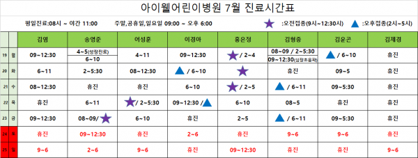 아이웰어린이병원 21.07.19~07.25 진료시간표입니다. 페이지 정보 작성자 관리자 작성일21-07-18 16:30 조회13,124회 관련링크 이전글 다음글 목록 본문 . 이전글 다음글 목록