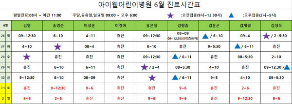 아이웰어린이병원 23.06.26~7.2 진료시간표입니다. 페이지 정보 작성자 관리자 작성일23-06-22 17:45 조회12,489회 관련링크 이전글 다음글 목록 본문 . 이전글 다음글 목록