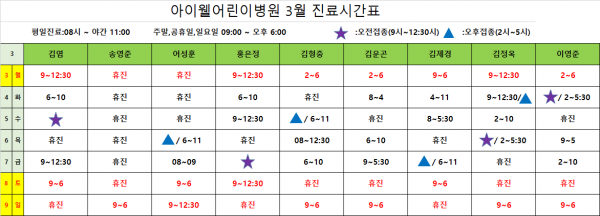 아이웰어린이병원 25.03.03~03.09 진료시간안내입니다. 페이지 정보 작성자 관리자 작성일25-02-26 10:09 조회5,003회 관련링크 이전글 다음글 목록 본문 . 이전글 다음글 목록