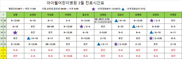아이웰어린이병원 25.03.17~03.23 진료시간 안내입니다. 페이지 정보 작성자 관리자 작성일25-03-13 20:48 조회4,865회 관련링크 이전글 다음글 목록 본문 진료시간표는 아이웰어린이병원 인스타그램에서도 확인가능합니다. 예약취소는 카카오채널을 이용해주세요 이전글 다음글 목록