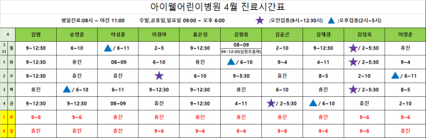 아이웰어린이병원 25.03.31~04.06 진료시간표안내입니다. 페이지 정보 작성자 관리자 작성일25-03-27 14:45 조회4,789회 관련링크 이전글 다음글 목록 본문 진료시간표는 아이웰어린이병원 인스타그램에서도 확인가능합니다. 예약취소는 카카오채널을 이용해주세요 이전글 다음글 목록