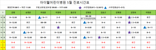 아이웰어린이병원 25.05.12~05.18 진료시간 안내입니다. 페이지 정보 작성자 관리자 작성일25-05-08 17:03 조회3,852회 관련링크 이전글 다음글 목록 본문 진료시간표는 아이웰어린이병원 인스타그램에서도 확인가능합니다. 예약취소는 카카오채널을 이용해주세요 이전글 다음글 목록