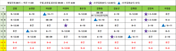 아이웰어린이병원 25.06.09~06.15 진료시간표 안내입니다. 페이지 정보 작성자 관리자 작성일25-06-05 10:16 조회3,102회 관련링크 이전글 다음글 목록 본문 진료시간표는 아이웰어린이병원 인스타그램에서도 확인가능합니다. 예약취소는 카카오채널을 이용해주세요 이전글 다음글 목록