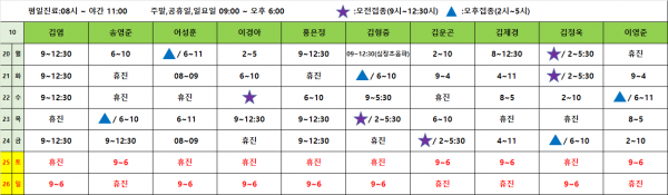 아이웰어린이병원 25.10.20~10.26 진료시간안내입니다. 페이지 정보 작성자 관리자 작성일25-10-16 15:38 조회2,106회 관련링크 이전글 다음글 목록 본문 진료시간표는 아이웰어린이병원 인스타그램에서도 확인 가능합니다. 예약취소는 카카오채널을 이용해주세요. 이전글 다음글 목록