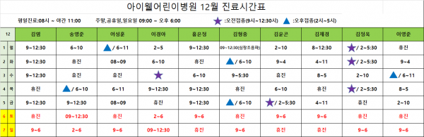 아이웰어린이병원 25.12.01~12.07 진료시간안내입니다. 페이지 정보 작성자 관리자 작성일25-11-28 11:37 조회1,557회 관련링크 이전글 다음글 목록 본문 .진료시간표는 아이웰어린이병원 인스타그램에서도 확인 가능합니다. 예약취소는 카카오채널을 이용해주세요. 이전글 다음글 목록