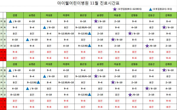 아이웰어린이병원 2018.11.19~12.2 진료시간표입니다. 페이지 정보 작성자 관리자 작성일18-11-17 16:47 조회24,601회 관련링크 이전글 다음글 목록 본문 . 이전글 다음글 목록