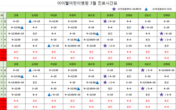 아이웰어린이병원 19.03.04~03.17 진료시간표입니다. 페이지 정보 작성자 관리자 작성일19-03-01 14:48 조회21,986회 관련링크 이전글 다음글 목록 본문 1 이전글 다음글 목록