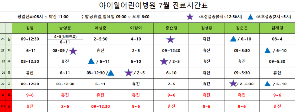 아이웰어린이병원 21.07.26~8.1 진료시간표입니다 페이지 정보 작성자 관리자 작성일21-07-23 11:13 조회13,280회 관련링크 이전글 다음글 목록 본문 . 이전글 다음글 목록