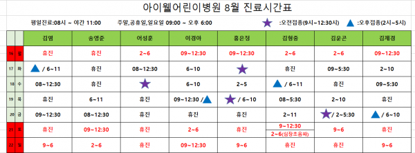 아이웰어린이병원 8.16~8.22 진료시간표입니다. 페이지 정보 작성자 관리자 작성일21-08-12 17:00 조회13,007회 관련링크 이전글 다음글 목록 본문 . 이전글 다음글 목록