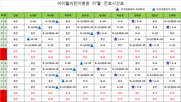 아이웰어린이병원 7월17일~7월30일 시간표입니다. 페이지 정보 작성자 관리자 작성일17-07-12 10:31 조회24,882회 관련링크 이전글 다음글 목록 본문 여름 휴가 기간입니다. 무더위에 건강 유의 하기시 바랍니다. 이전글 다음글 목록