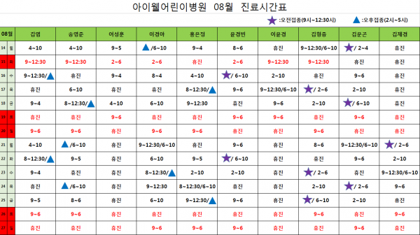 아이웰어린이병원 8.14~27 시간표 페이지 정보 작성자 관리자 작성일17-08-09 17:08 조회24,596회 관련링크 이전글 다음글 목록 본문 8.14일부터 28일 시간표 입니다. 이전글 다음글 목록