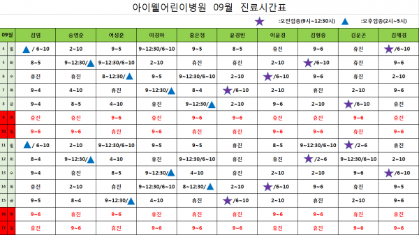 아이웰어린이병원 17.09.04~09.17 시간표 입니다. 페이지 정보 작성자 관리자 작성일17-08-29 10:01 조회24,992회 관련링크 이전글 다음글 목록 본문 9월 첫째주,둘째주 시간표 입니다. 변경사항 있을시 팝업으로 홈페이지에 안내 하겠습니다. 이전글 다음글 목록