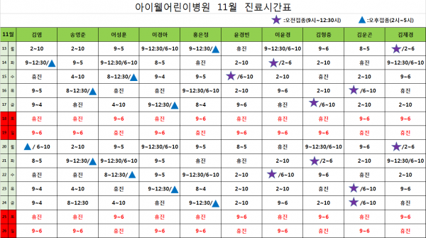 아이웰어린이병원 11.13~26일 진료시간표입니다. 페이지 정보 작성자 관리자 작성일17-11-14 10:19 조회23,771회 관련링크 이전글 다음글 목록 본문 시간표 변경사항 있어서 다시 올렸습니다. 확인하시고 진료에 차질없으시길 바랍니다. 이전글 다음글 목록