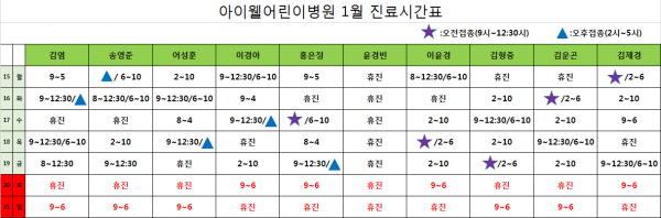 아이웰어린이병원 18.1.15~21일 시간표입니다. 페이지 정보 작성자 관리자 작성일18-01-14 10:42 조회22,659회 관련링크 이전글 다음글 목록 본문 18.01.15~01.21 이전글 다음글 목록