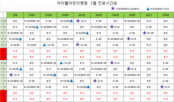 아이웰어린이병원 18.01.22~02.04 시간표입니다. 페이지 정보 작성자 관리자 작성일18-01-17 11:39 조회24,716회 관련링크 이전글 다음글 목록 본문 1월22일~2월4일 시간표입니다. 이전글 다음글 목록