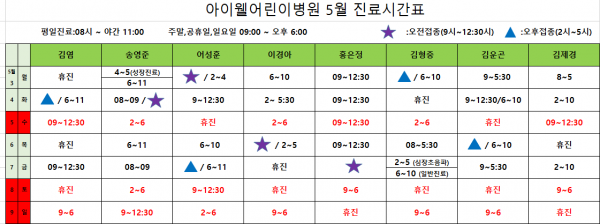 아이웰어린이병원 21.05.03~05.09 진료시간표입니다.
