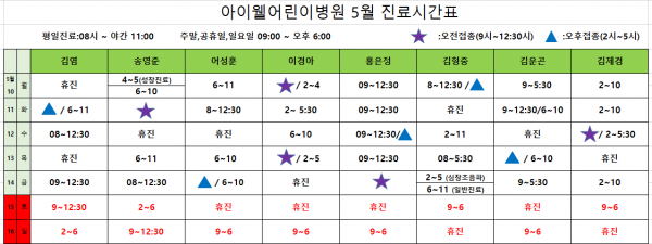 아이웰어린이병원 21.05.10~05.16 진료시간표입니다.