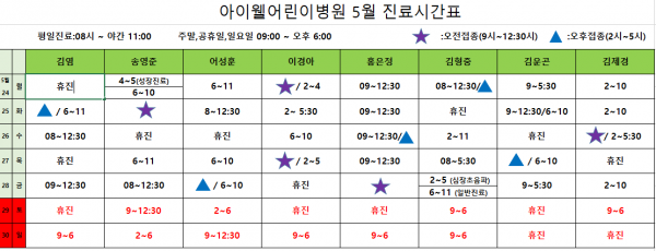 아이웰어린이병원 21.05.24~05.30 진료시간표 입니다. 페이지 정보 작성자 관리자 작성일21-05-22 13:37 조회14,172회 관련링크 이전글 다음글 목록 본문 . 이전글 다음글 목록