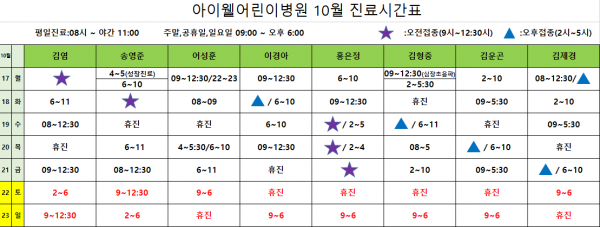 아이웰어린이병원 22.10.17~10.23 진료시간표입니다. 페이지 정보 작성자 관리자 작성일22-10-12 17:49 조회12,286회 관련링크 이전글 다음글 목록 본문 . 이전글 다음글 목록