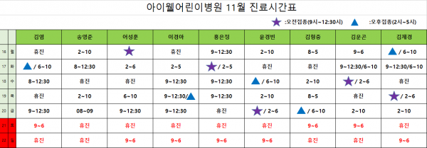 아이웰어린이병원 20.11.16~11.22 진료시간표입니다. 페이지 정보 작성자 관리자 작성일20-11-12 14:37 조회15,790회 관련링크 이전글 다음글 목록 본문 . 이전글 다음글 목록
