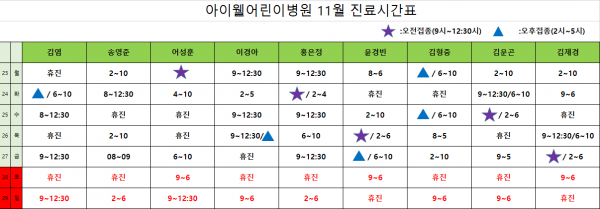 아이웰어린이병원 11.23~29 진료시간표입니다. 페이지 정보 작성자 관리자 작성일20-11-20 17:57 조회15,320회 관련링크 이전글 다음글 목록 본문 . 이전글 다음글 목록