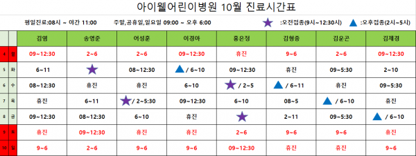아이웰어린이병원 10.4~10.10 진료시간표입니다. 페이지 정보 작성자 관리자 작성일21-10-01 16:51 조회13,235회 관련링크 이전글 다음글 목록 본문 . 이전글 다음글 목록