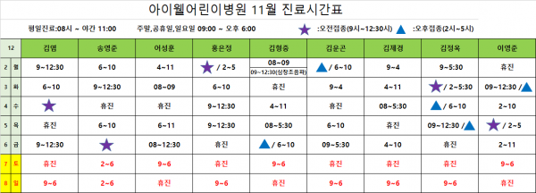 아이웰어린이병원 24.12.2~12.08 진료시간표안내입니다. 페이지 정보 작성자 관리자 작성일24-11-28 16:50 조회6,786회 관련링크 이전글 다음글 목록 본문 . 이전글 다음글 목록
