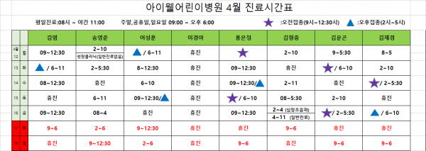 아이웰어린이병원 21.04.12~04.19 진료시간표입니다.