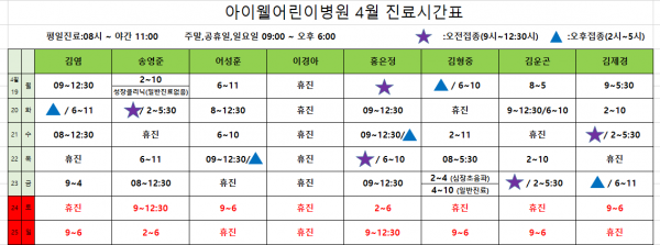 아이웰어린이병원 21.04.19~04.25 진료시간표입니다