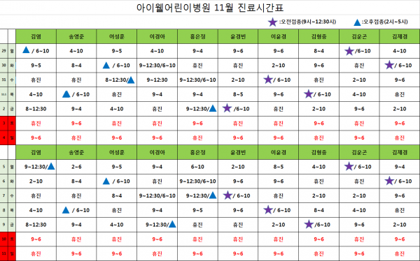 아이웰어린이병원 2018.10.29~11.11 진료시간표입니다. 페이지 정보 작성자 관리자 작성일18-10-27 11:43 조회24,232회 관련링크 이전글 다음글 목록 본문 . 이전글 다음글 목록