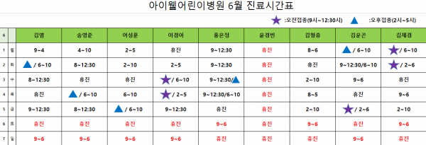 아이웰어린이병원 6.1~6.7 진료시간표입니다. 페이지 정보 작성자 관리자 작성일20-05-31 15:23 조회17,854회 관련링크 이전글 다음글 목록 본문 . 이전글 다음글 목록