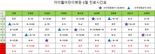 아이웰어린이병원 20.06.08~06.14 진료시간표입니다. 페이지 정보 작성자 관리자 작성일20-06-03 09:31 조회18,344회 관련링크 이전글 다음글 목록 본문 . 이전글 다음글 목록