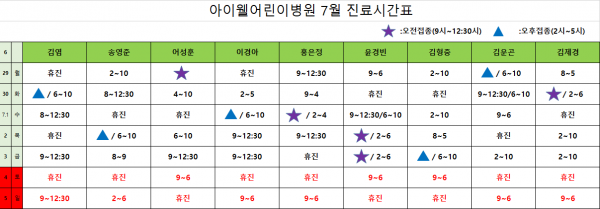 아이웰어린이병원 6.29~7.5일 진료시간표입니다. 페이지 정보 작성자 관리자 작성일20-06-25 16:05 조회16,344회 관련링크 이전글 다음글 목록 본문 . 이전글 다음글 목록